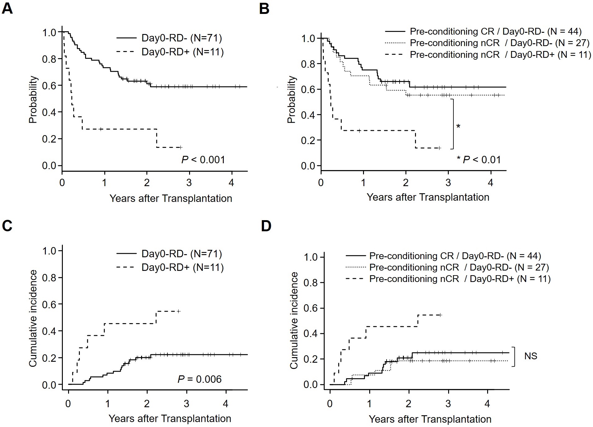This is a retrospective analysis in a single institution where day 0 BM was routinely examined. However, BM aspiration on the day of allo-HSCT is not widely performed in clinical practice. The clinical significance of minimal/measurable RD has been reportedly assessed in BM before conditioning treatment8-10. Because all the patients in CR before conditioning treatment showed Day 0-RD- as expected, our results suggest that Day 0 BM evaluation is necessary for only patients in nCR at the point of pre-conditioning assessment to minimize the risk of this invasive procedure.
