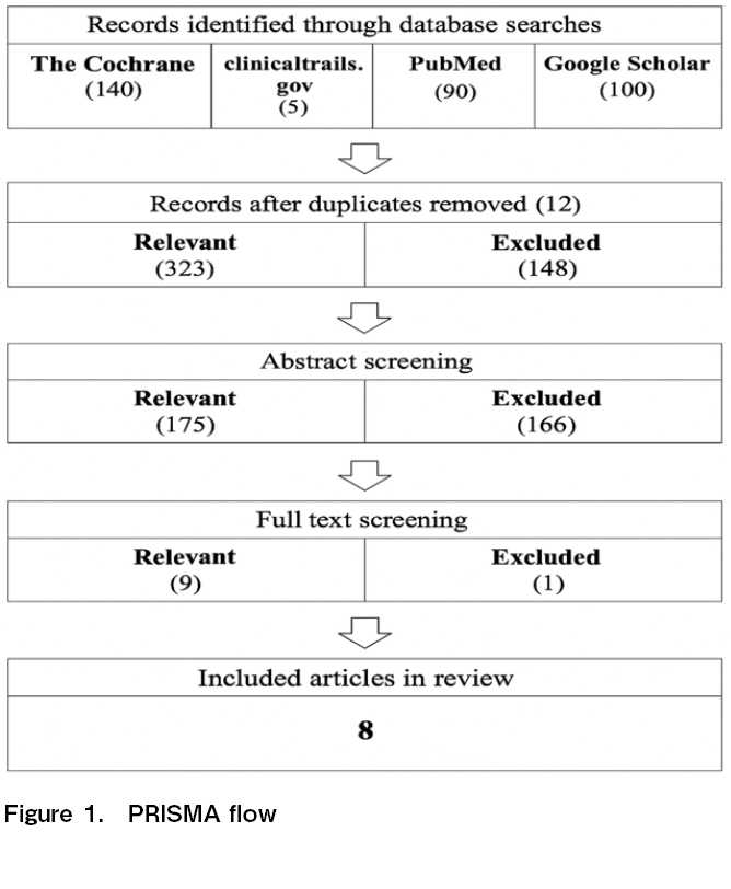 The PRISMA flow diagram (Figure 1) illustrates the systematic search and selection process undertaken to identify relevant studies for this review. A total of 335 studies were initially identified in the broad search. Duplicate copies were accounted for prior to title/abstract screening where 12 studies were excluded. The researchers then conducted a title screening, during which 148 studies were excluded; followed by abstract screening which excluded 166 studies. The exclusion of these studies was mainly due to unavailability of full text and failure to meet the specified inclusion criteria. Nine (9) studies underwent a detailed full-text evaluation, where the researchers carefully assessed each study to ensure alignment with the established criteria. However, one study was excluded in this phase mainly because of sampling demographics in the study which covered young patients, unavailability of data required in assessing outcome parameters, and being outdated from the 10-year recency timeframe established in the inclusion criteria.