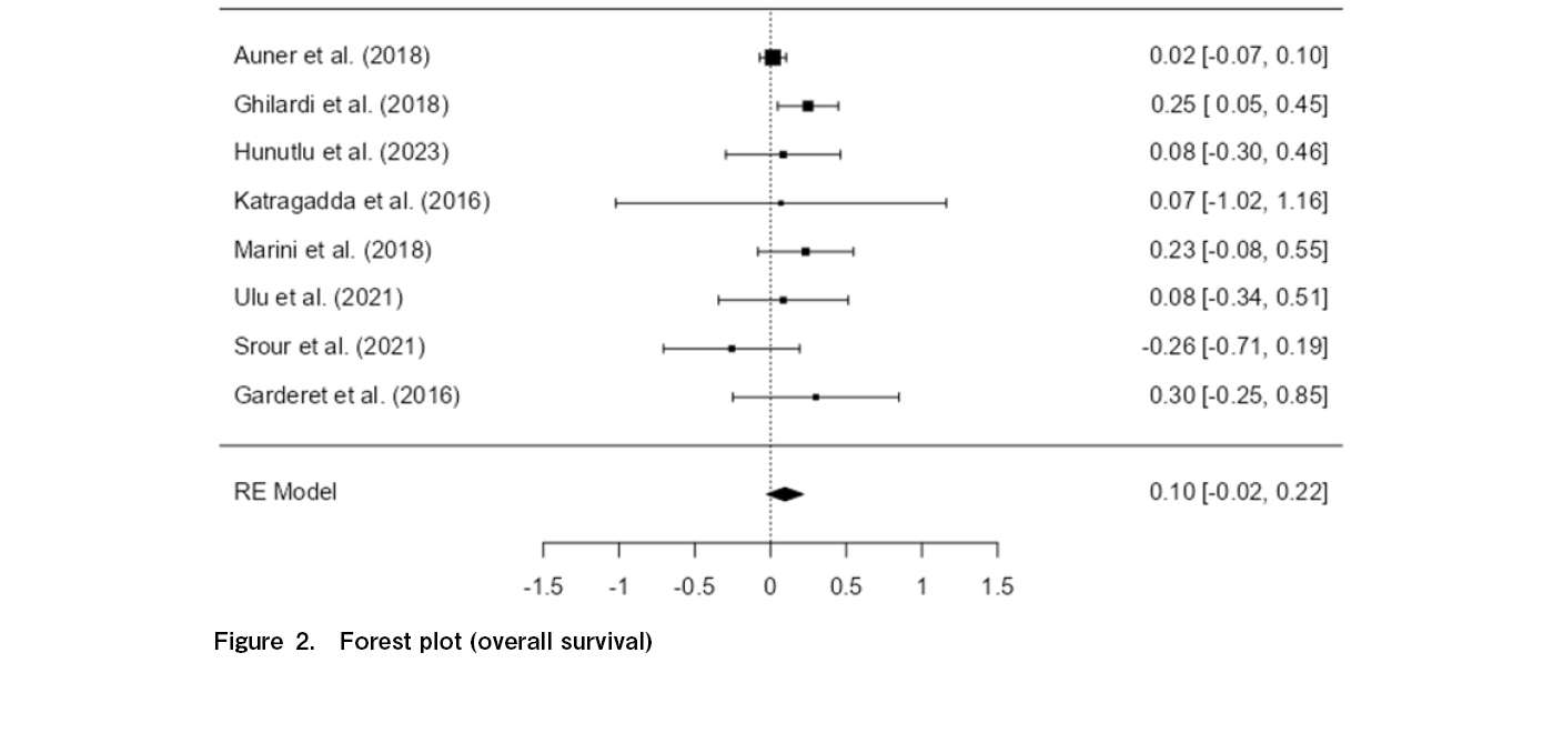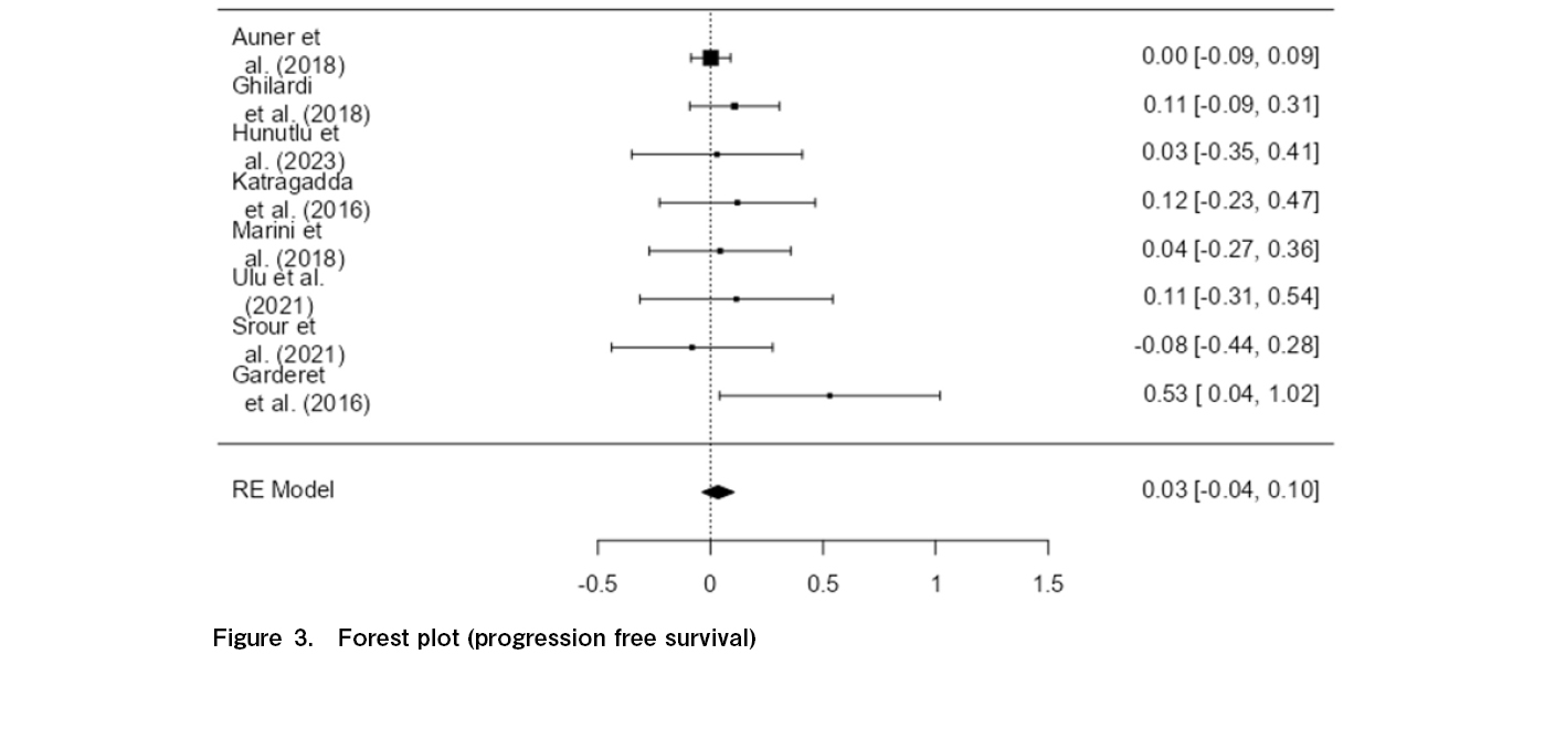 In this study, heterogeneity was assessed using multiple statistical methods, including the I-squared (I2) statistic, Tau-squared (τ2) estimate, Chi-square test, and a visual forest plot (see Figure 2 and 3) for each primary outcome parameter (i.e., OS and PFS). The I2 statistic measures the percentage of total variation across studies that is due to heterogeneity rather than chance, with I2 value between 0% and 25% reflecting low heterogeneity, while values above 50% suggests high heterogeneity. However, said I2 is not an absolute measure of heterogeneity13. Hence, other statistical measures were employed like τ2 statistic, which quantifies the variance in effect sizes across studies, as well as the Chi-squared test to formally assess the presence of heterogeneity.