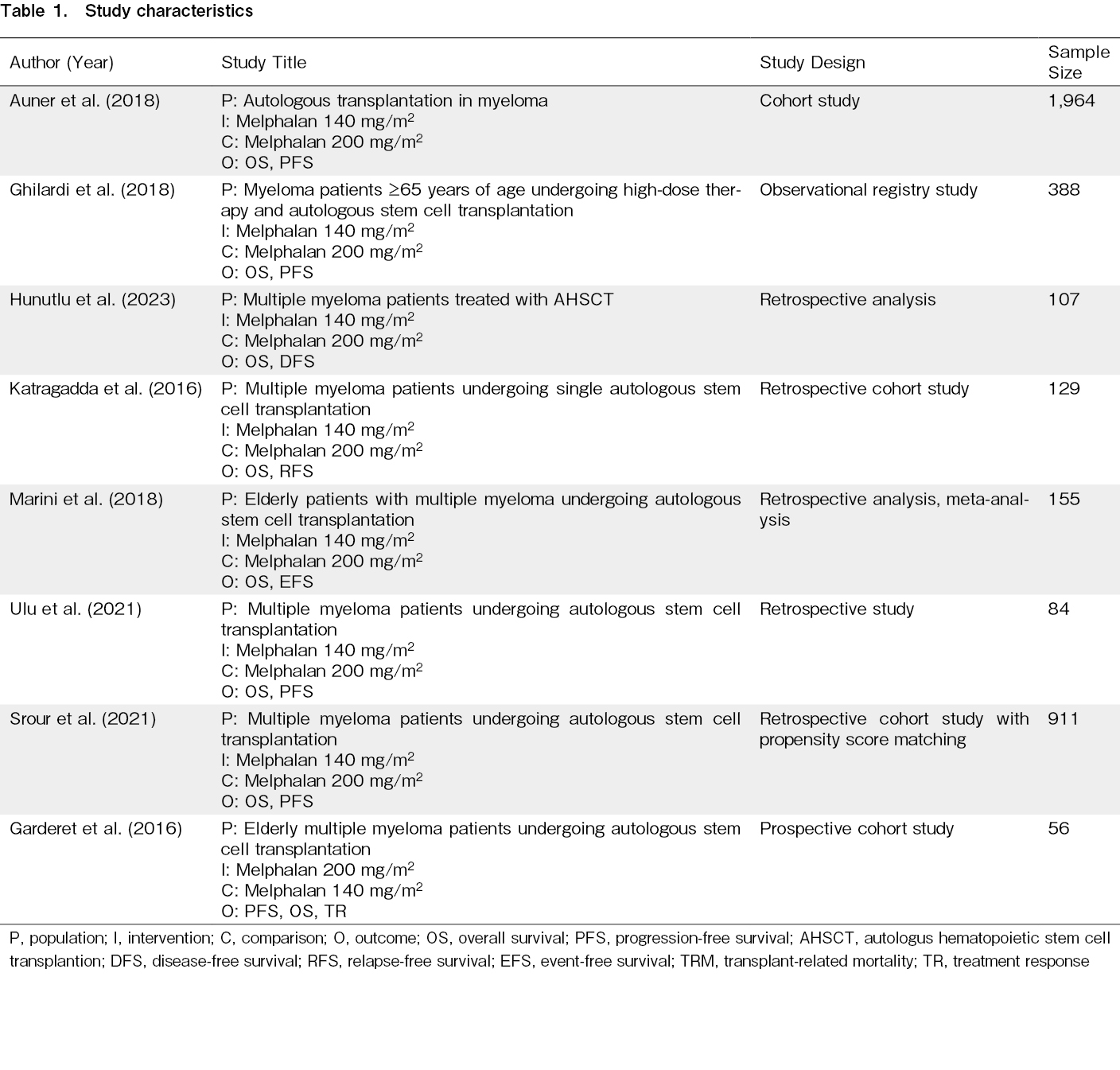 Table 1 summarizes the key attributes of the included research studies on the use of reduced versus standard-dose melphalan as a conditioning regimen in AHSCT for multiple myeloma. Overall, the studies span various design methodologies, including cohort (n=2), observational registry (n=1), and retrospective analyses (n=5). The combined sample size was 3,721, with the largest study involving 1,964 participants12.