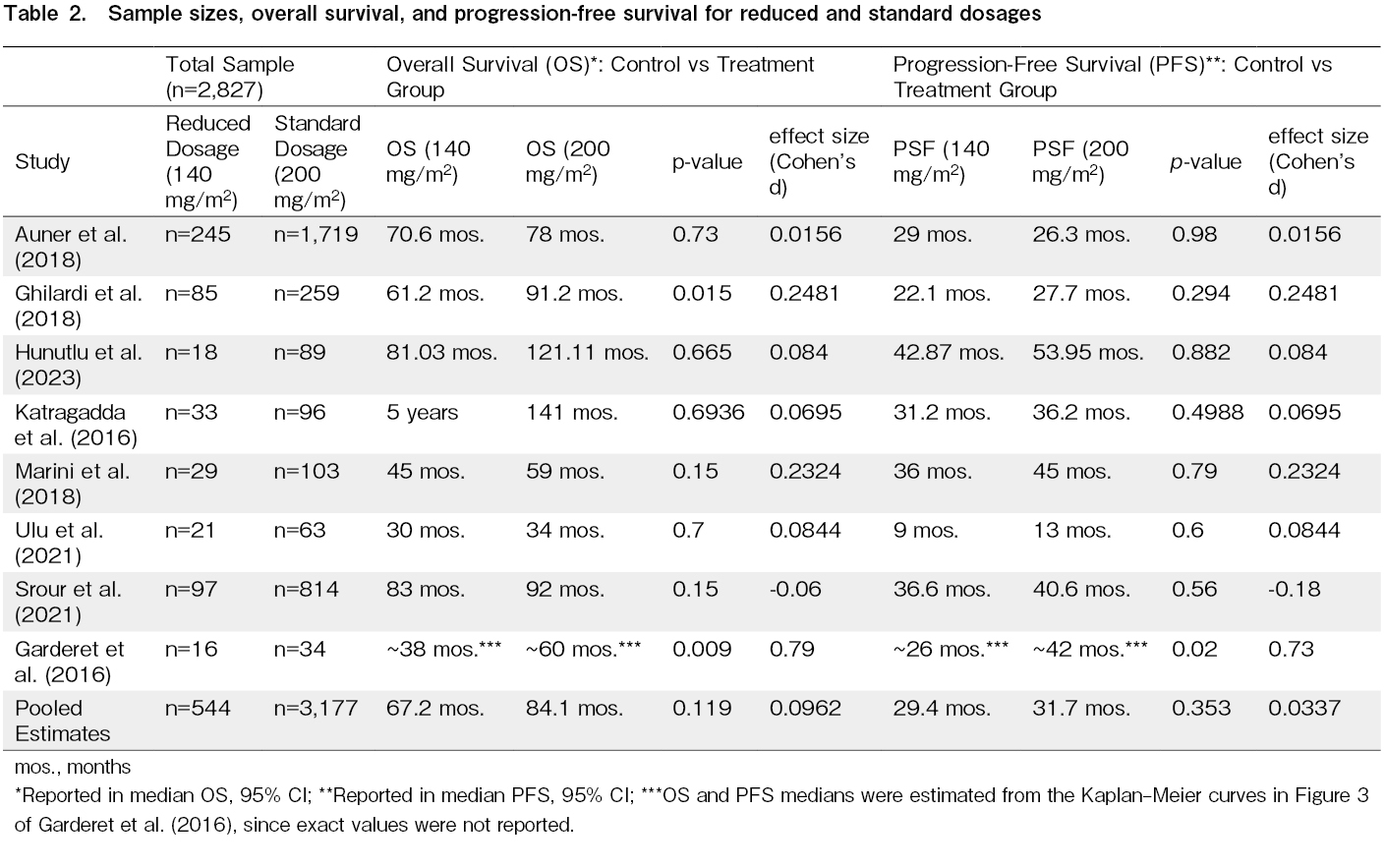 This paper's analysis―which covered outcomes from eight studies (published within the ten years as of today) with a total of 3,721 patients―showed no significant differences (p > 0.05) between the two dosage groups across primary indicators of OS and PFS. Likewise, systematic review on secondary outcome parameters, such as NRM, TRM, and ET, consistently showed no significant difference (p > 0.05). Of note, RDM was given to older patients, those who were frail, or had renal co-morbidities.