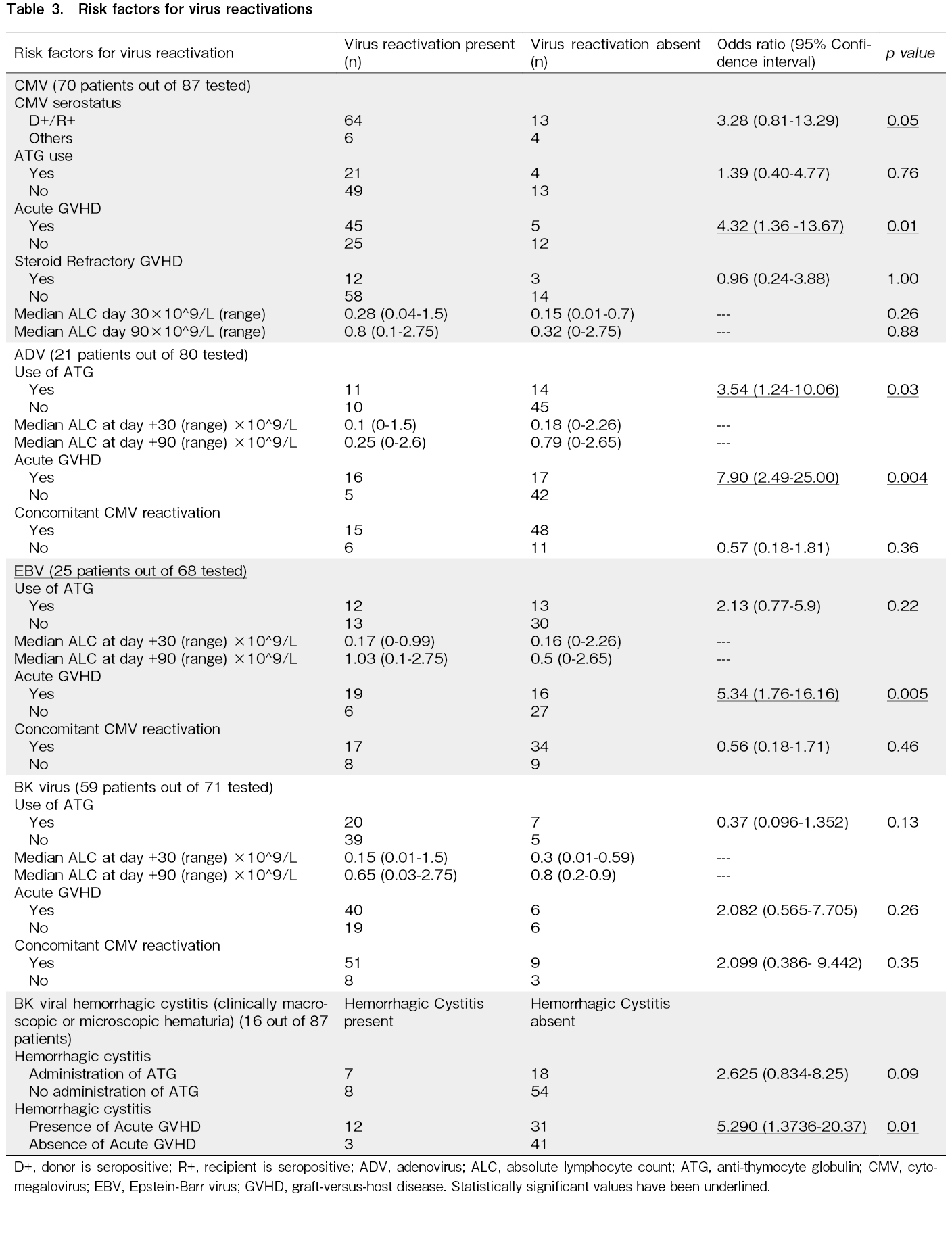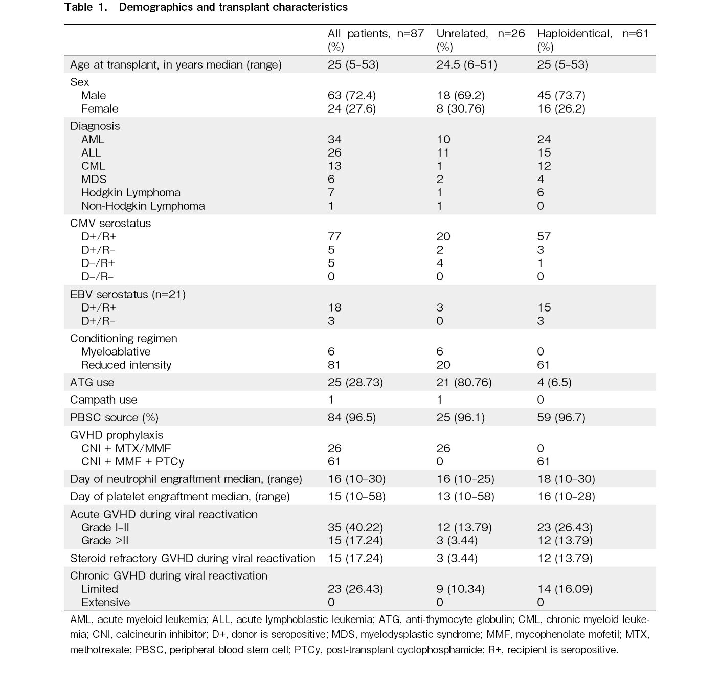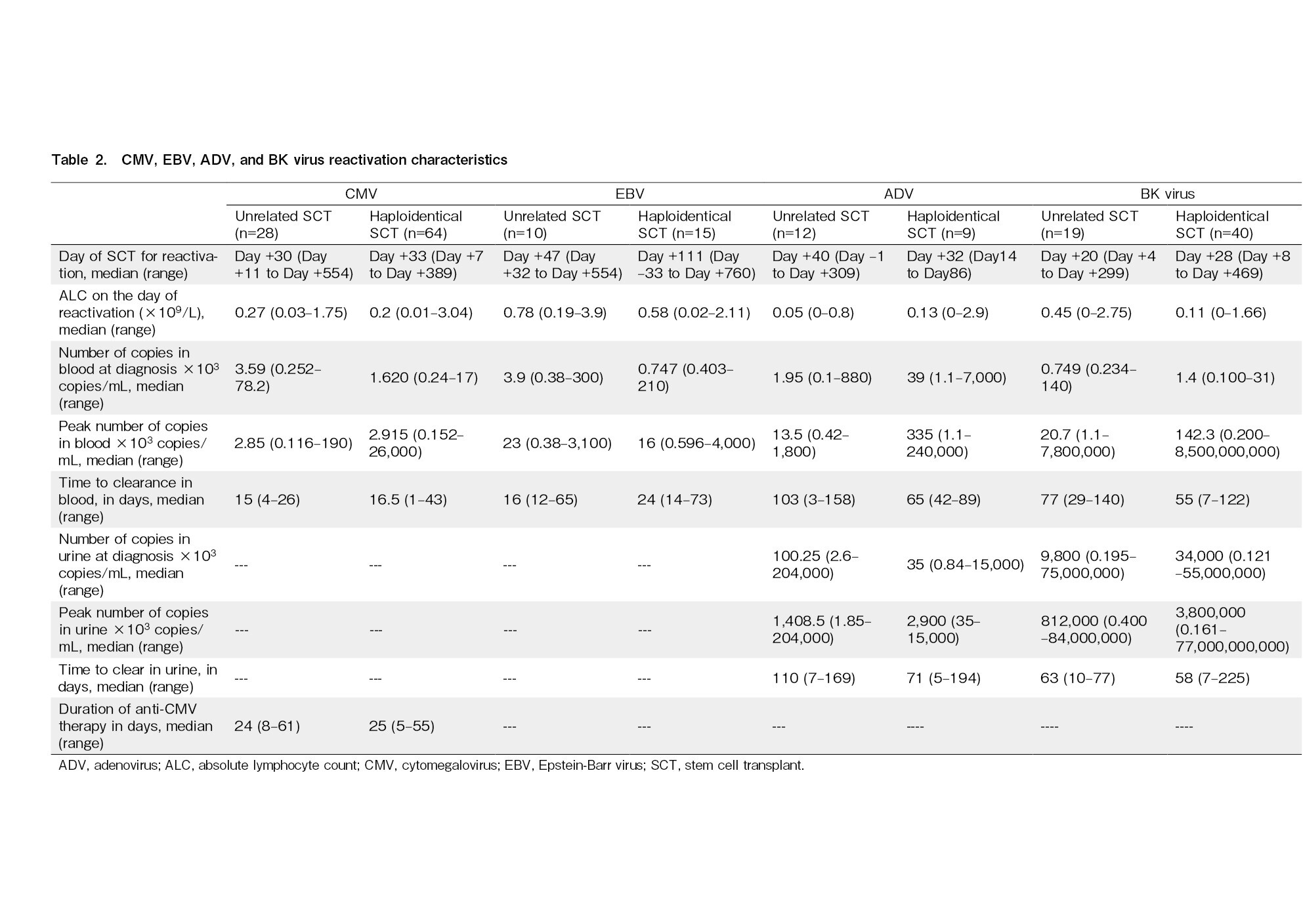 Results: The incidence of cytomegalovirus (CMV), Epstein-Barr virus (EBV), and adenovirus (ADV) reactivation was 80.5, 36.7, and 26%, respectively. CMV colitis was observed in six patients (8.5%). Acute graft-versus-host disease (GVHD) was a significant risk factor for CMV reactivation. Four patients (5%) developed ADV disease requiring treatment with cidofovir. Anti-thymocyte globulin use and acute GVHD were significant risk factors for ADV reactivation. Mild hemorrhagic cystitis due to BK virus was observed in 32% patients. However, significant cystitis requiring intervention was seen in only four patients. Two patients developed EBV-related lymphoproliferative disorder and one patient experienced human herpes virus 6-related graft failure. Viral reactivations had no impact on overall survival.