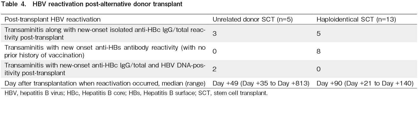 Thirty-one patients (35%) were started on lamivudine or entecavir prophylaxis because of positive HBV serology pre-transplantation. In total, 18 patients (20.68%; 95% CI, 12.75%-30.71%) underwent UDT or HIT and developed post-transplant HBV reactivation (new-onset positive serology with transaminitis), of whom eight developed reactivation within 100 days (Table 4). Of these 18 patients, only two tested HBV DNA-positive in peripheral blood. There were no cases of co-existing liver GVHD/chronic GVHD. Entecavir was started in eight and lamivudine in nine of these patients for post-transplant HBV reactivation and continued for 2 years post-transplantation. HCV reactivation was not observed in this cohort.