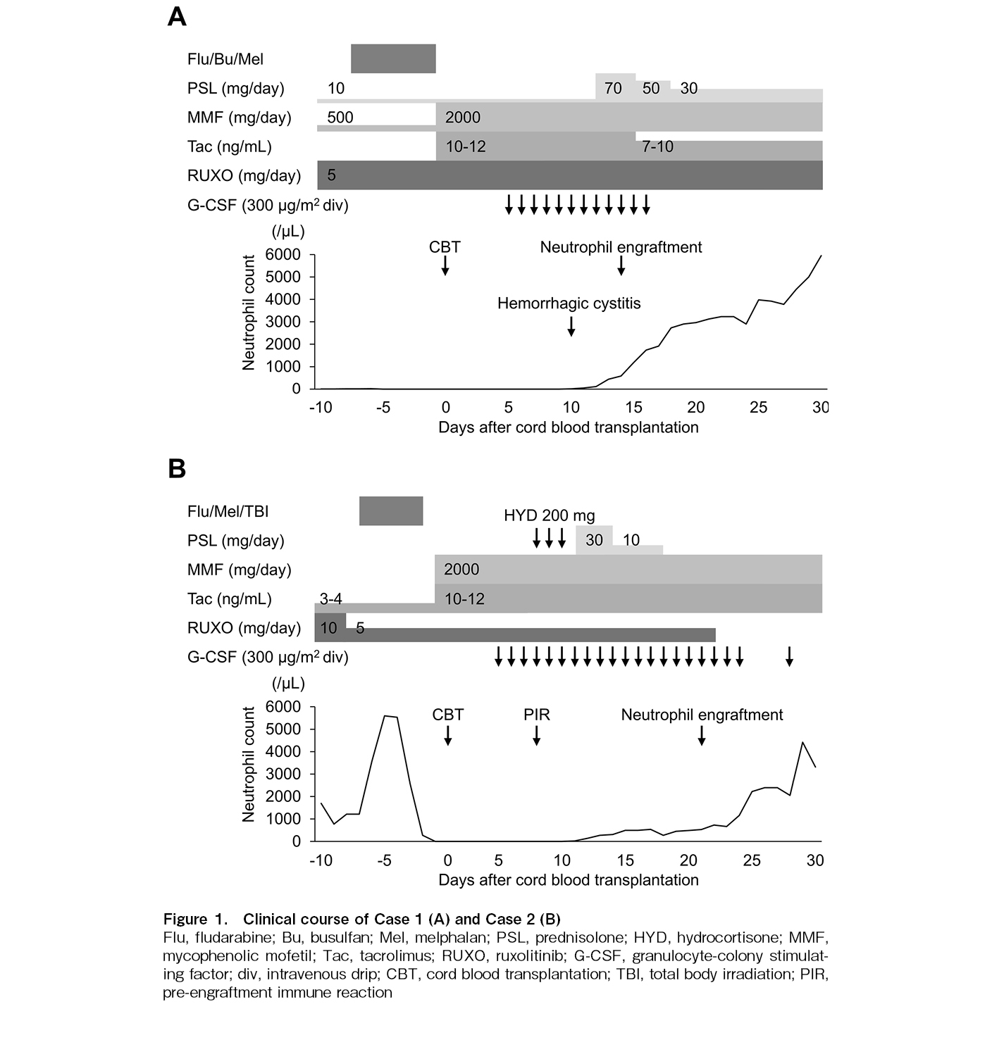 We report two cases of successful neutrophil engraftment following CBT with concurrent ruxolitinib administration. Ruxolitinib was initially approved as a treatment for myelofibrosis and demonstrated effectiveness against symptoms such as splenomegaly and other clinical manifestations4,5. Additionally, ruxolitinib has proven effective for steroid-refractory acute and chronic GVHD6,7. Therefore, ruxolitinib is expected to benefit patients undergoing AlloSCT with myelofibrosis by reducing splenomegaly and improving engraftment potential9, as well as those needing a novel strategy for GVHD prophylaxis. However, its use in AlloSCT raises concerns regarding engraftment due to its hematopoietic effects. In placebo-controlled trials for patients with myelofibrosis, grade 3 or 4 anemia, thrombocytopenia, and neutropenia occurred more frequently with ruxolitinib than with the placebo5. Similarly, higher rates of cytopenia were observed in patients with acute GVHD6 and chronic GVHD, compared with those in the control arms (best available therapy arms)7.