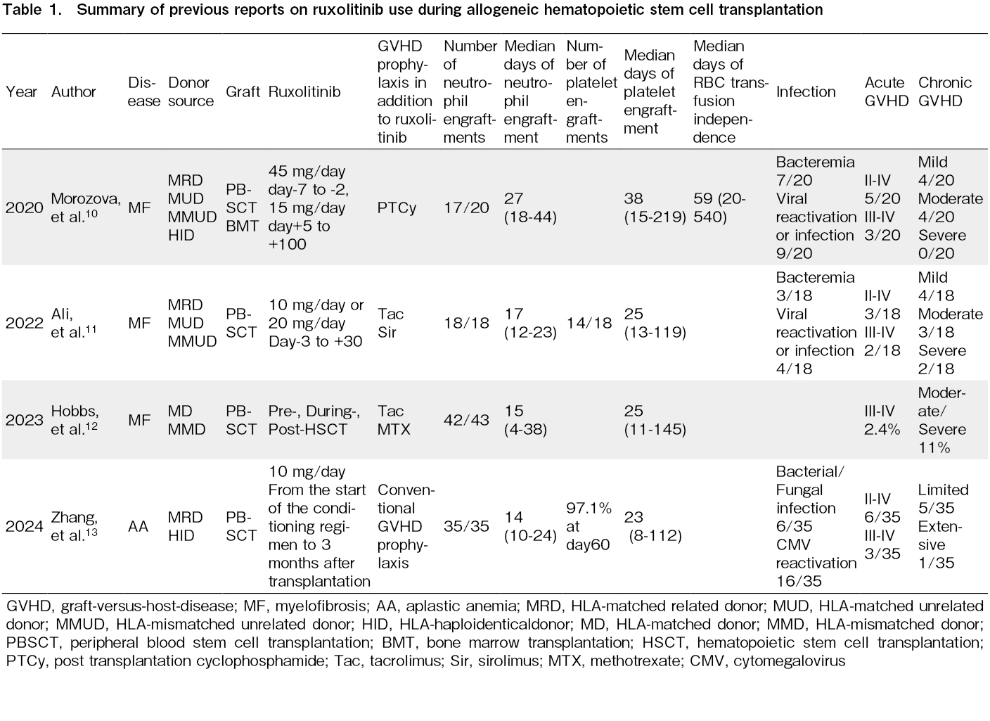 Ruxolitinib has shown efficacy during allogeneic hematopoietic stem cell transplantation (AlloSCT) for the management of myelofibrosis and prophylaxis of GVHD8,9. Despite the hematopoietic toxicity of ruxolitinib, successful engraftment has been reported. In these cases, patients underwent peripheral blood stem cell transplantation (PBSCT) or bone marrow transplantation, both of which typically involve the infusion of a higher number of stem cells than umbilical cord blood transplantation (CBT). To our knowledge, no reports have documented successful engraftment with concurrent ruxolitinib administration in CBT. In this report, we present two cases of successful neutrophil engraftment following CBT with concurrent ruxolitinib administration, along with a review of the literature on ruxolitinib use in stem cell transplantation.